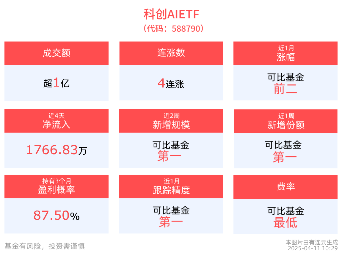 跟踪精度方面,截至2025年4月10日,科创AIETF近1月跟踪误差为0.010%,在可比基金中跟踪精度最高。