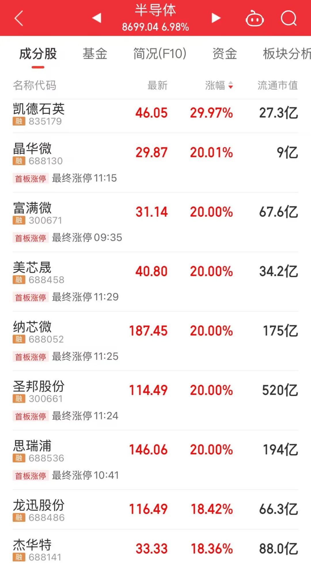 半导体产业链上午大爆发,掀起涨停潮。晶华微、富满微、民德电子、思瑞浦等多股迎来“20CM”涨停,存储芯片、芯片封装等板块涨幅居前。