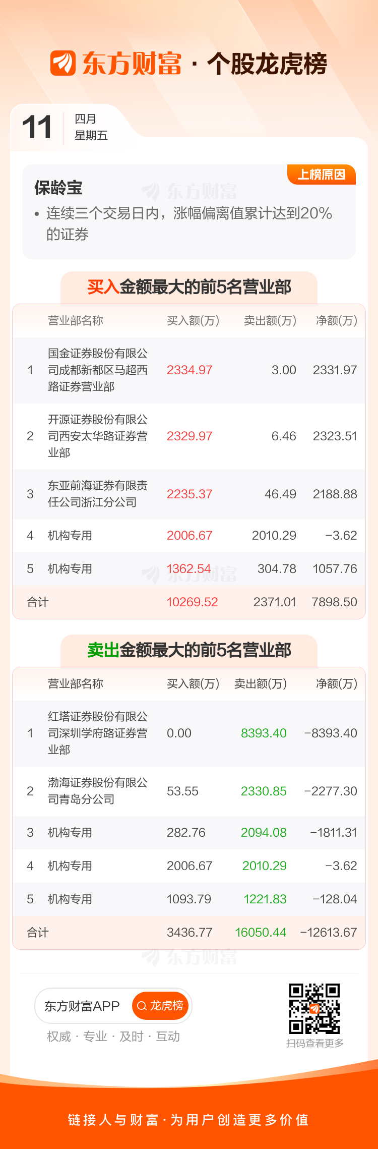 交易所2025年4月11日公布的交易公开信息显示,保龄宝因成为连续三个交易日内,涨幅偏离值累计达到20%的证券上榜。保龄宝当日收报8.68元,涨跌幅10.01%,换手率21.44%,成交额6.66亿。异常期间4月9日至4月11日,期间涨幅25.62%,累计偏离值20.59%,区间成交额8.76亿。