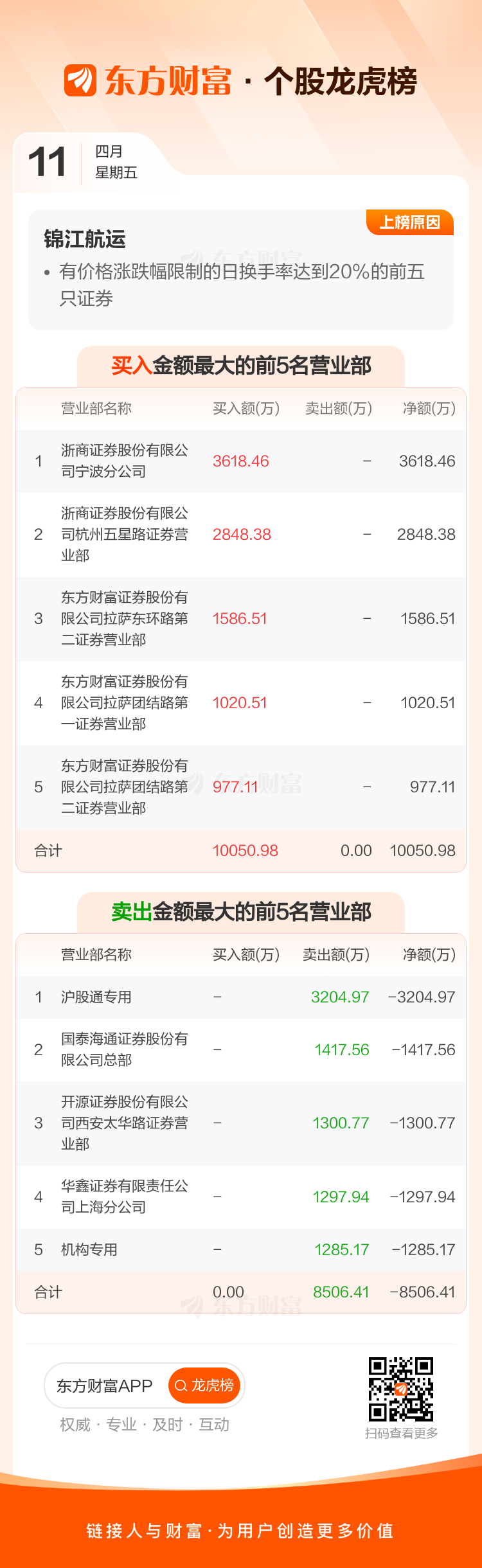 交易所2025年4月11日公布的交易公开信息显示,锦江航运因成为有价格涨跌幅限制的日换手率达到20%的前五只证券上榜。锦江航运当日收报10.72元,涨跌幅-2.72%,偏离值51.02%,换手率51.02%,成交额11.28亿。
