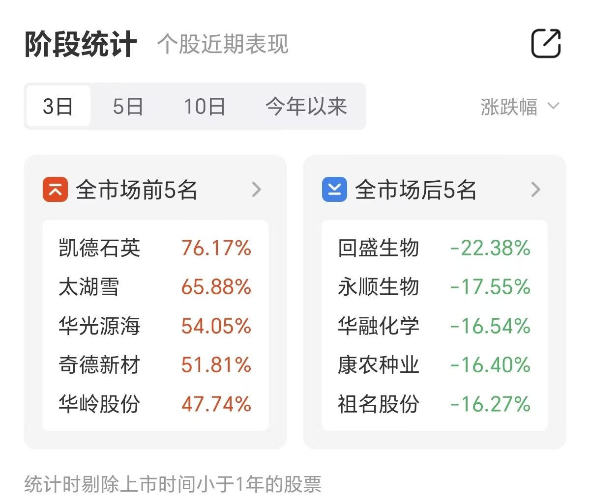 4月11日市场全天延续反弹,A股全市场涨幅前五名分别为凯德石英、太湖雪、华光源海、奇德新材、华岭股份,其中华凯德石英三日涨幅达76.17%,位列涨幅榜第一。