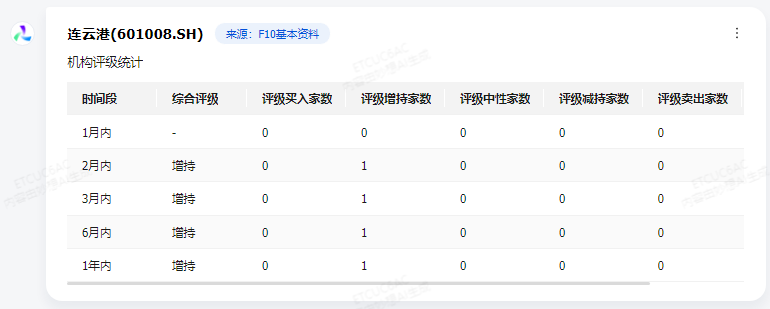 连云港最新机构评级为“增持”,近2月内、3月内、6月内及1年内均有1家机构给出该评级,无其他类型评级。