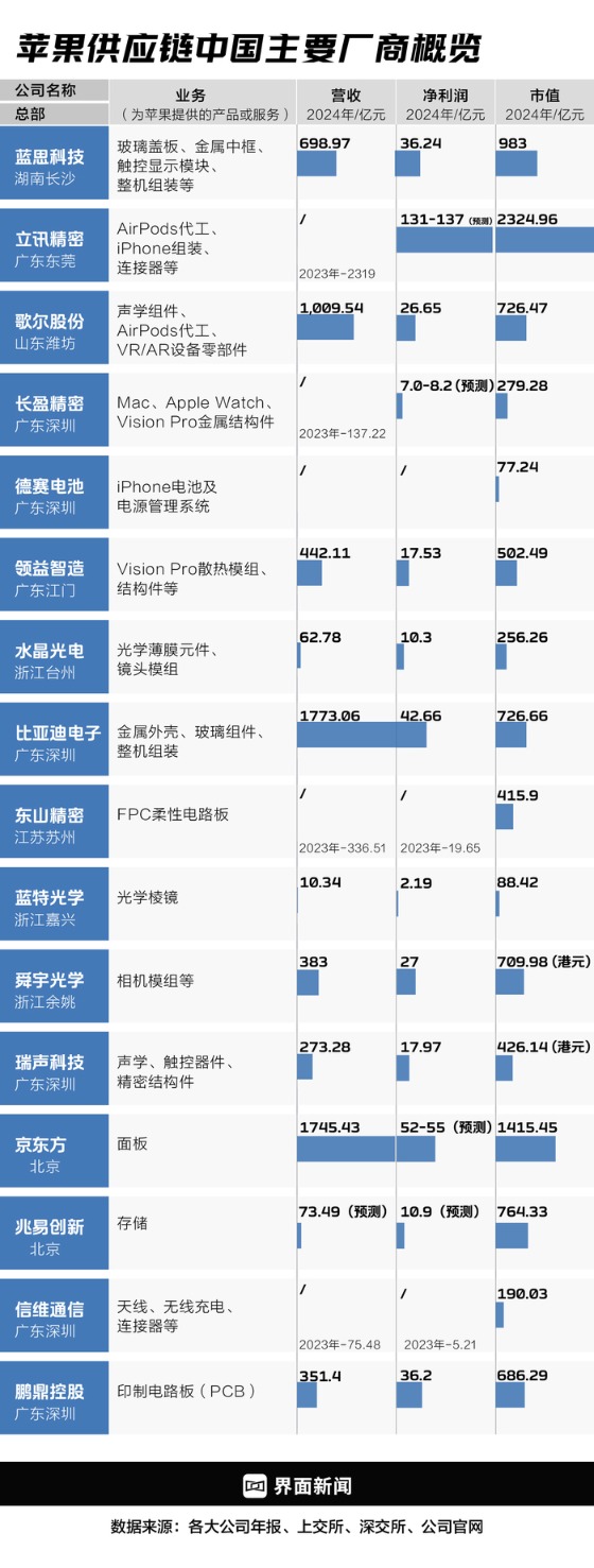 一位资深供应链人士对界面新闻表示,消费电子组装环节和其他结构件利润率相对较低,尤其是组装,净利润率仅有2%,压价空间极小。“很多供应商都是专供苹果的,他们利润多少苹果一清二楚。我认为苹果心里是有数的,基本上没有空间了。”而相比之下,面板和半导体制造(如台积电)环节利润率相对较高,压价的可能性更大。