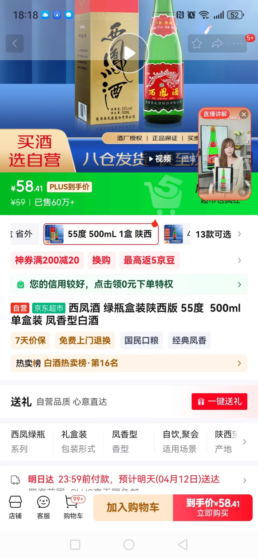 2025年4月11日西凤京东自营旗舰店的老绿瓶陕西版售价截图