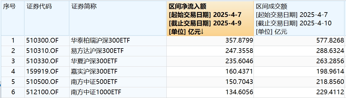 相比之下,主流宽基ETF更受资金青睐。数据显示,截至4月9日,本周前三个交易日,股票型ETF区间资金净流入额合计接近1800亿元。其中,4只沪深300ETF资金净流入额包揽前四名,分别属于华泰柏瑞、易方达、华夏、嘉实基金旗下,资金净流入额排名第五和第六的分别是南方中证500ETF和南方中证1000ETF,前述6只ETF资金净流入额均破百亿元,合计超1200亿元,占股票型ETF总资金流入额的比例超七成。