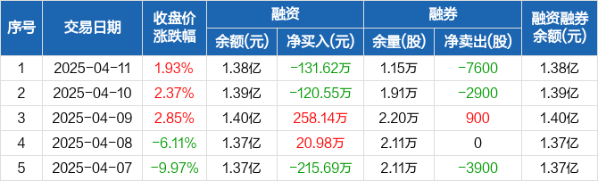 融资方面,当日融资买入313.42万元,融资偿还445.05万元,融资净偿还131.62万元。融券方面,融券卖出0股,融券偿还7600股,融券余量1.15万股,融券余额3.04万元。融资融券余额合计1.38亿元。