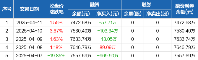 融资方面,当日融资买入270.66万元,融资偿还328.37万元,融资净偿还57.71万元,连续3日净偿还累计174.1万元。融券方面,融券卖出0股,融券偿还0股,融券余量0股,融券余额0元。融资融券余额合计7472.68万元。