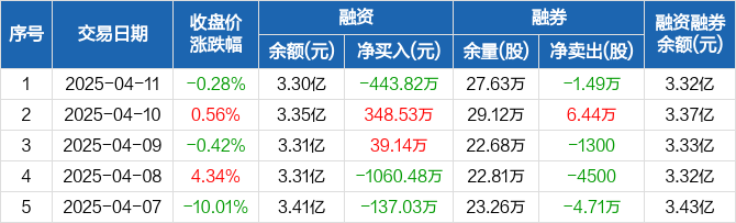融资方面,当日融资买入102.52万元,融资偿还546.33万元,融资净偿还443.82万元。融券方面,融券卖出2.27万股,融券偿还3.76万股,融券余量27.63万股,融券余额199.24万元。融资融券余额合计3.32亿元。