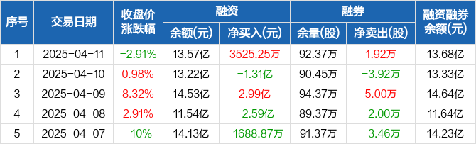 融资方面,当日融资买入4.22亿元,融资偿还3.87亿元,融资净买入3525.25万元。融券方面,融券卖出1.95万股,融券偿还300股,融券余量92.37万股,融券余额1108.44万元。融资融券余额合计13.68亿元。