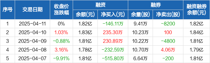融资方面,当日融资买入221.07万元,融资偿还367.17万元,融资净偿还146.11万元。融券方面,融券卖出0股,融券偿还8200股,融券余量9.41万股,融券余额64.55万元。融资融券余额合计1.82亿元。