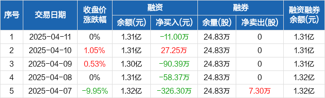 融资方面,当日融资买入131.93万元,融资偿还142.93万元,融资净偿还11万元。融券方面,融券卖出0股,融券偿还0股,融券余量24.83万股,融券余额47.92万元。融资融券余额合计1.31亿元。