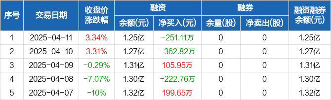 融资方面,当日融资买入516.61万元,融资偿还767.72万元,融资净偿还251.11万元。融券方面,融券卖出0股,融券偿还0股,融券余量0股,融券余额0元。融资融券余额合计1.25亿元。