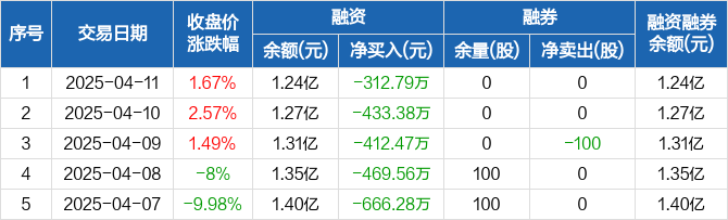 融资方面,当日融资买入491.76万元,融资偿还804.55万元,融资净偿还312.79万元,连续5日净偿还累计2294.5万元。融券方面,融券卖出0股,融券偿还0股,融券余量0股,融券余额0元。融资融券余额合计1.24亿元。