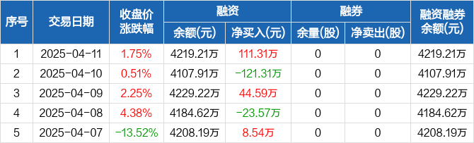 融资方面,当日融资买入282.93万元,融资偿还171.63万元,融资净买入111.31万元。融券方面,融券卖出0股,融券偿还0股,融券余量0股,融券余额0元。融资融券余额合计4219.21万元。
