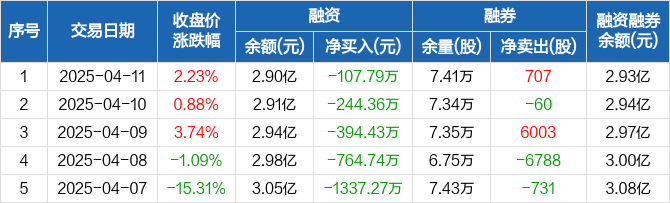 融资方面,当日融资买入904.3万元,融资偿还1012.1万元,融资净偿还107.79万元,连续12日净偿还累计5064.7万元。融券方面,融券卖出1347股,融券偿还640股,融券余量7.41万股,融券余额322.45万元。融资融券余额合计2.93亿元。