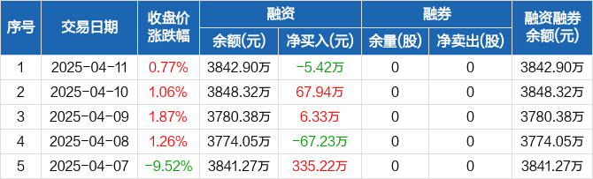 融资方面,当日融资买入90.82万元,融资偿还96.24万元,融资净偿还5.42万元。融券方面,融券卖出0股,融券偿还0股,融券余量0股,融券余额0元。融资融券余额合计3842.9万元。