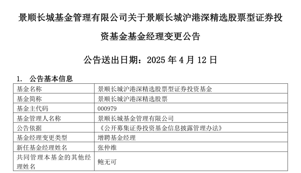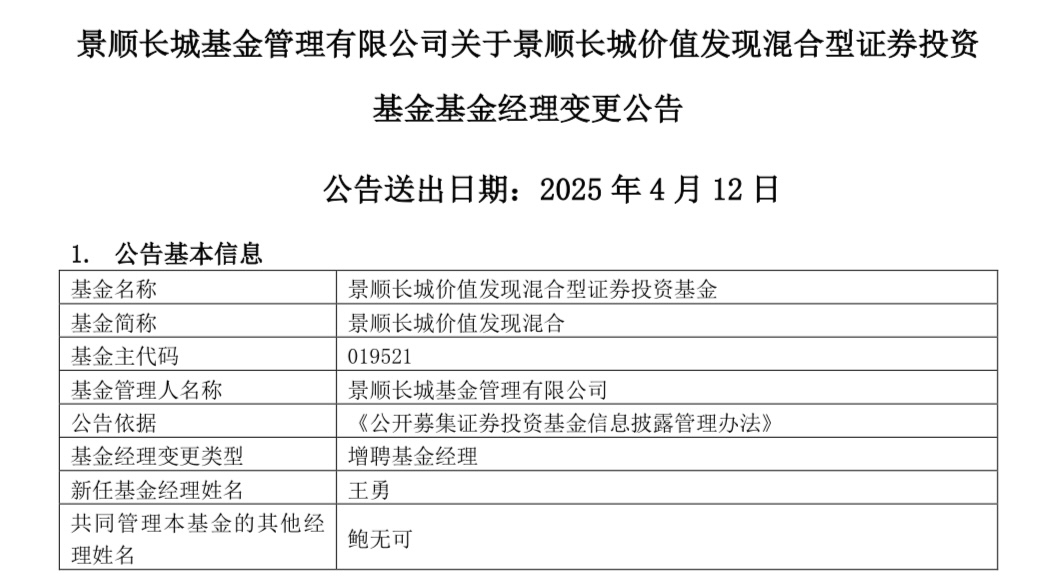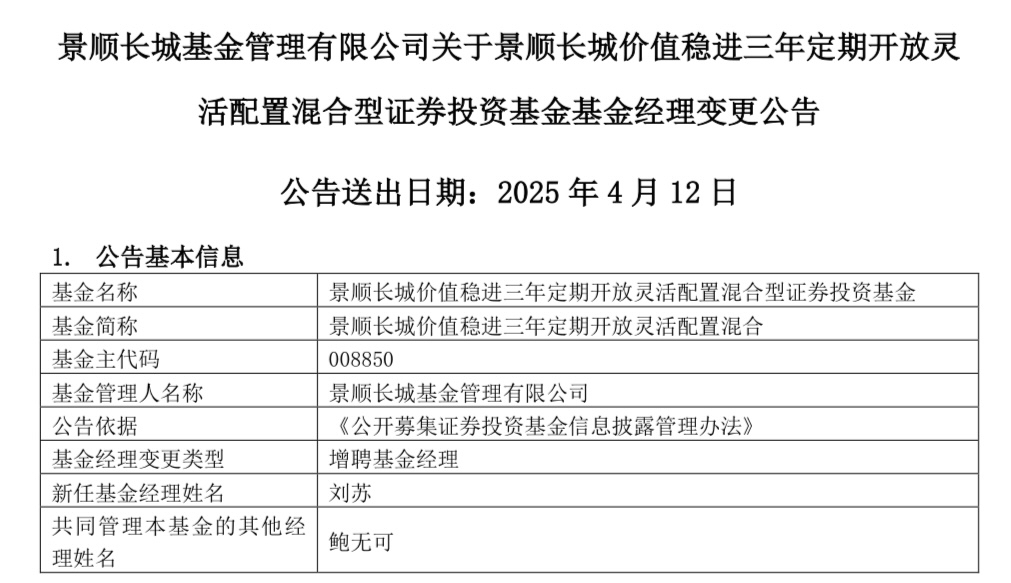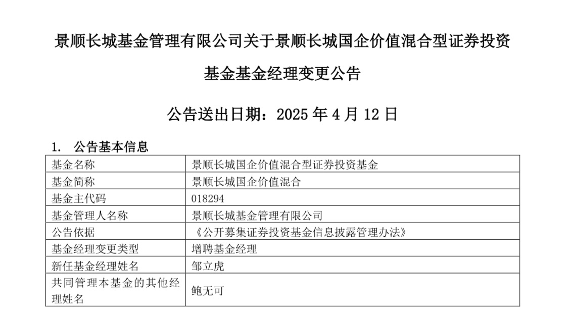 红星资本局4月12日消息,又一知名基金经理旗下产品增聘人手。今日,景顺长城基金连发4则公告,鲍无可在管的景顺长城价值稳进三年定期开放、景顺长城国企价值、景顺长城沪港深精选、景顺长城价值发现4只基金,分别增聘基金经理刘苏、邹立虎、张仲维、王勇共同管理。