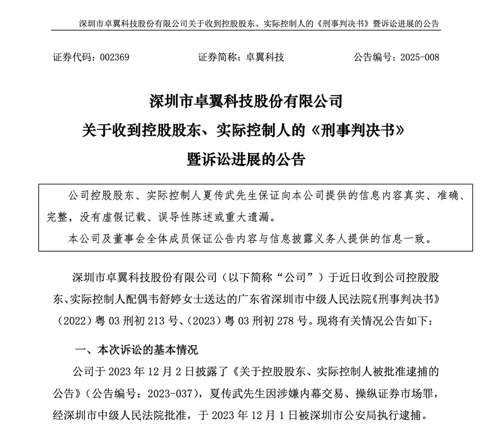 在公司控股股东、实际控制人夏传武被警方逮捕一年零四个多月后,4月11日晚间,卓翼科技(股票代码:002369)发布公告,披露了法院一审判决结果。