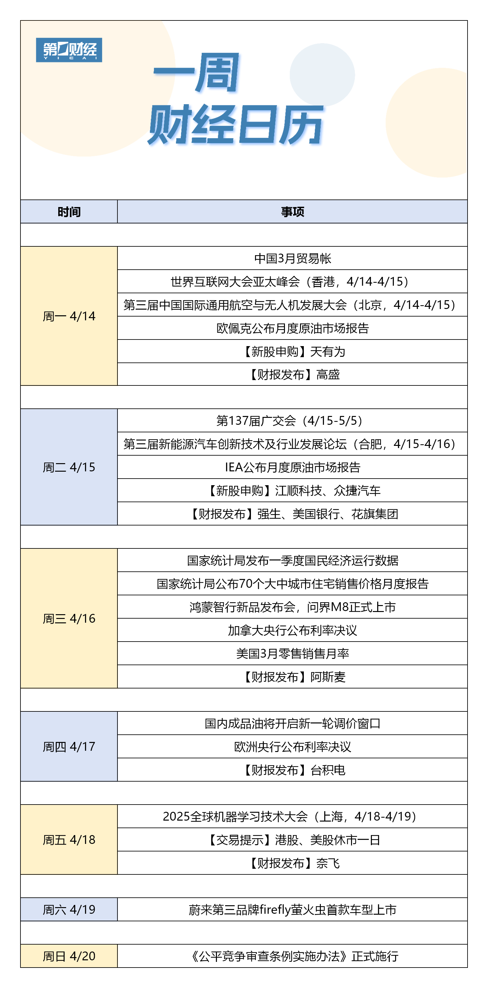 【下周财经日历】4月14日-4月20日: