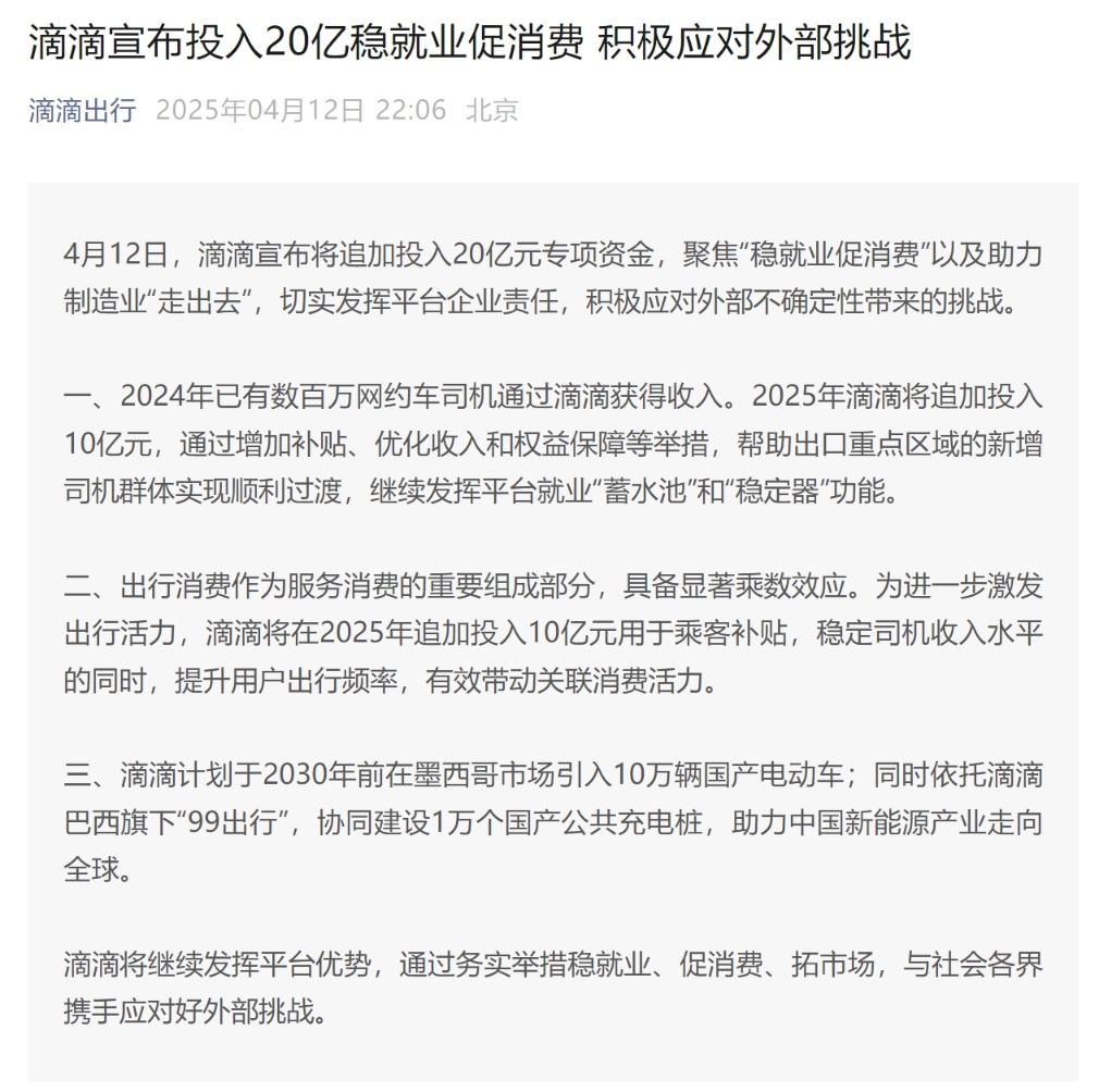每经AI快讯,4月12日,滴滴宣布将追加投入20亿元专项资金,聚焦“稳就业促消费”以及助力制造业“走出去”,切实发挥平台企业责任,积极应对外部不确定性带来的挑战。2025年滴滴将追加投入10亿元,通过增加补贴、优化收入和权益保障等举措,帮助出口重点区域的新增司机群体实现顺利过渡,继续发挥平台就业“蓄水池”和“稳定器”功能。为进一步激发出行活力,滴滴将在2025年追加投入10亿元用于乘客补贴,稳定司机收入水平的同时,提升用户出行频率,有效带动关联消费活力。计划于2030年前在墨西哥市场引入10万辆国产电动车;同时依托滴滴巴西旗下“99出行”,协同建设1万个国产公共充电桩,助力中国新能源产业走向全球。