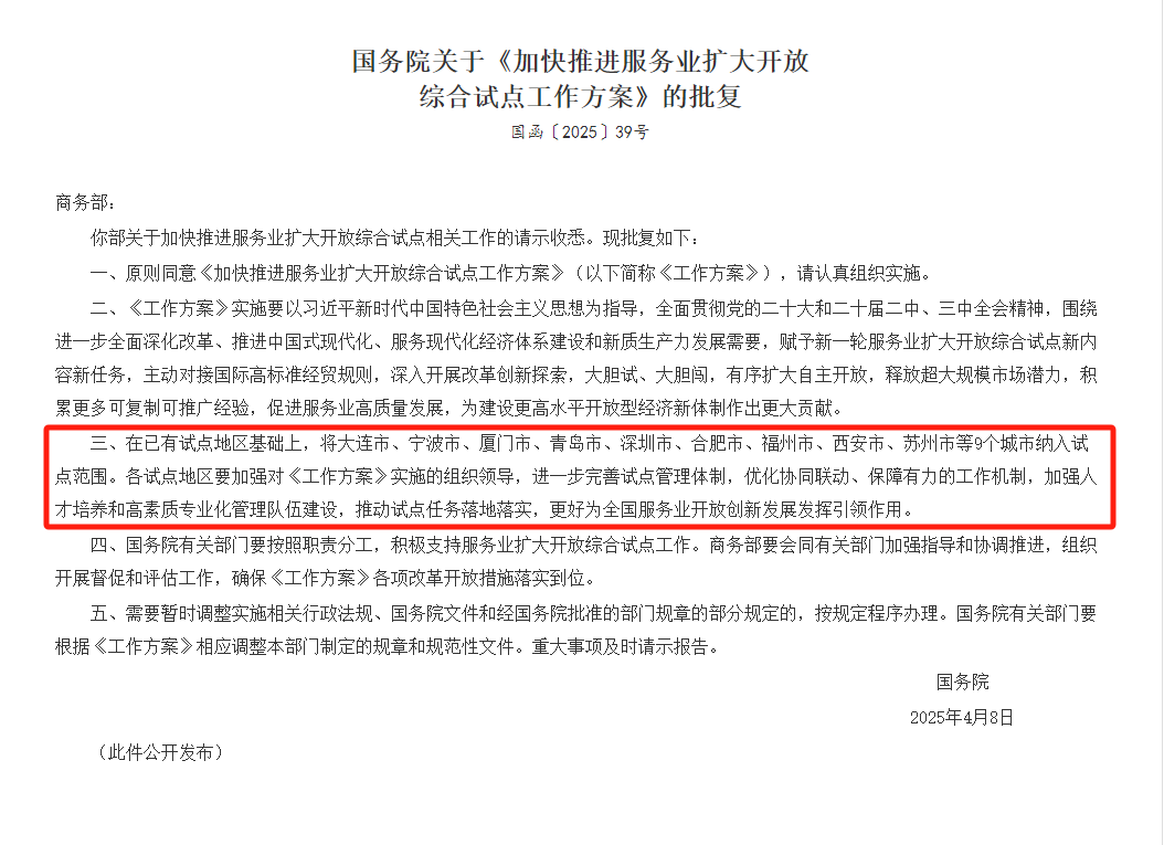 4月11日,中国政府网发布国务院关于《加快推进服务业扩大开放综合试点工作方案》的批复。批复称,国务院原则同意《加快推进服务业扩大开放综合试点工作方案》。在已有试点地区基础上,将大连市、宁波市、厦门市、青岛市、深圳市、合肥市、福州市、西安市、苏州市等9个城市纳入试点范围。
