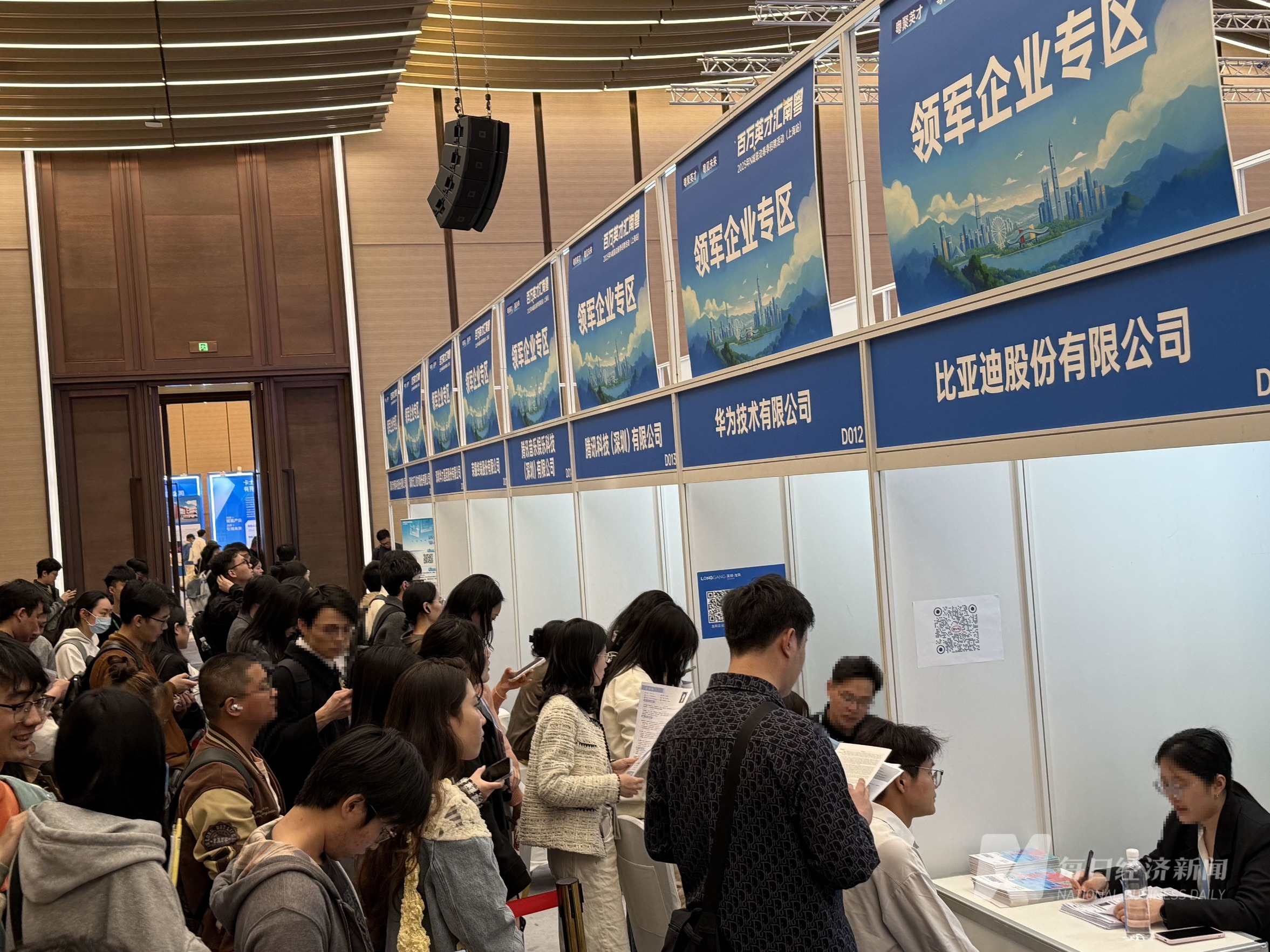 《每日经济新闻》记者在现场观察到,在参与招聘的众多企业中,国企、互联网以及高科技企业仍是求职者的心头好。虽是午休时间,华为、比亚迪、腾讯、华润等知名企业的招聘档口依旧被求职者围得水泄不通。