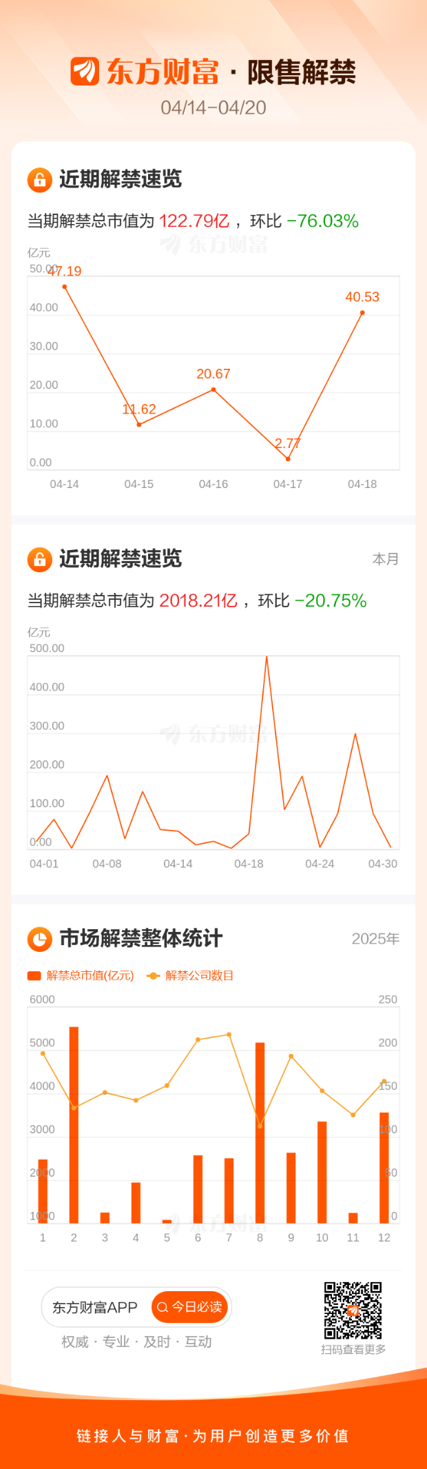 下周(4月14日至4月20日)有40家公司限售股陆续解禁,当期解禁总市值为122.79亿元,环比-76.03%。