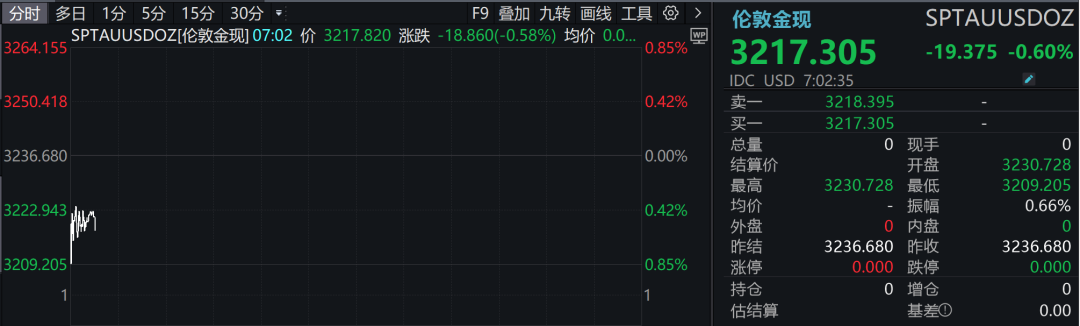 周一亚市盘初,黄金走低。现货黄金跌近20美元,现报3217.305美元/盎司。