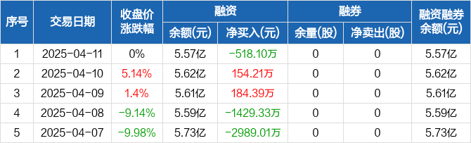 融资方面,当日融资买入2182.52万元,融资偿还2700.62万元,融资净偿还518.1万元。融券方面,融券卖出0股,融券偿还0股,融券余量0股,融券余额0元。融资融券余额合计5.57亿元。