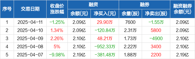 融资方面,当日融资买入334.94万元,融资偿还305.04万元,融资净买入29.9万元。融券方面,融券卖出100股,融券偿还1.56万股,融券余量7600股,融券余额9.64万元。融资融券余额合计2.09亿元。