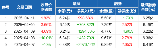 融资方面,当日融资买入6315.52万元,融资偿还5316.84万元,融资净买入998.68万元。融券方面,融券卖出0股,融券偿还1.79万股,融券余量5.5万股,融券余额184.14万元。融资融券余额合计6.25亿元。