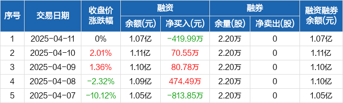 融资方面,当日融资买入300.94万元,融资偿还720.93万元,融资净偿还419.99万元。融券方面,融券卖出0股,融券偿还0股,融券余量2.2万股,融券余额6.71万元。融资融券余额合计1.07亿元。