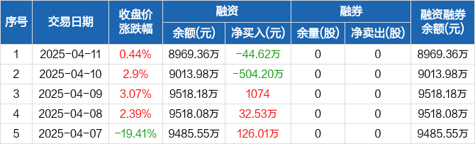 融资方面,当日融资买入135.65万元,融资偿还180.27万元,融资净偿还44.62万元。融券方面,融券卖出0股,融券偿还0股,融券余量0股,融券余额0元。融资融券余额合计8969.36万元。