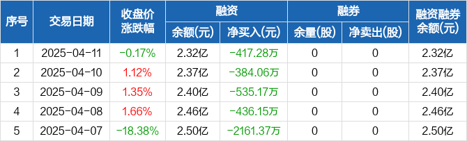 元道通信融资融券信息显示,2025年4月11日融资净偿还417.28万元;融资余额2.32亿元,较前一日下降1.76%。