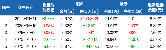 融资方面,当日融资买入2.19亿元,融资偿还1.84亿元,融资净买入3459.8万元。融券方面,融券卖出0股,融券偿还0股,融券余量21.01万股,融券余额299.6万元。融资融券余额合计6.7亿元。