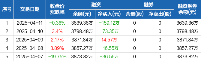 融资方面,当日融资买入188.93万元,融资偿还348.05万元,融资净偿还159.12万元。融券方面,融券卖出0股,融券偿还0股,融券余量0股,融券余额0元。融资融券余额合计3639.36万元。