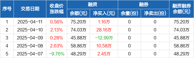 融资方面,当日融资买入1.81万元,融资偿还6494元,融资净买入1.16万元。融券方面,融券卖出0份,融券偿还0份,融券余量0份,融券余额0元。融资融券余额合计75.2万元。