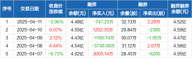 融资方面,当日融资买入2339.64万元,融资偿还3086.87万元,融资净偿还747.23万元。融券方面,融券卖出2.49万股,融券偿还2000股,融券余量32.13万股,融券余额427.6万元。融资融券余额合计4.52亿元。