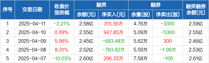 融资方面,当日融资买入2343.8万元,融资偿还2028.24万元,融资净买入315.56万元。融券方面,融券卖出3300股,融券偿还6600股,融券余量4.76万股,融券余额54.69万元。融资融券余额合计2.59亿元。