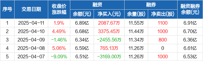 融资方面,当日融资买入1.63亿元,融资偿还1.42亿元,融资净买入2087.67万元。融券方面,融券卖出5400股,融券偿还4300股,融券余量11.55万股,融券余额216.45万元。融资融券余额合计6.91亿元。
