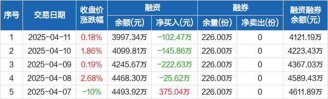 融资方面,当日融资买入355.98万元,融资偿还458.45万元,融资净偿还102.47万元,连续4日净偿还累计496.58万元。融券方面,融券卖出0份,融券偿还0份,融券余量226万份,融券余额123.85万元。融资融券余额合计4121.19万元。