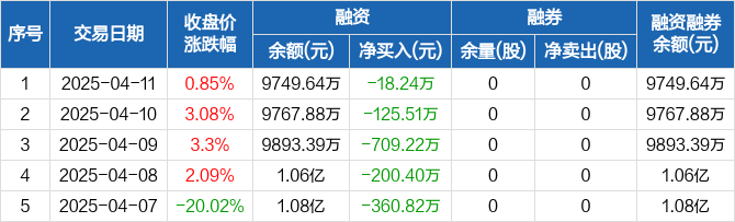 融资方面,当日融资买入357.4万元,融资偿还375.63万元,融资净偿还18.24万元,连续7日净偿还累计1722.84万元。融券方面,融券卖出0股,融券偿还0股,融券余量0股,融券余额0元。融资融券余额合计9749.64万元。