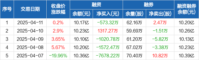融资方面,当日融资买入4273.73万元,融资偿还4847.05万元,融资净偿还573.32万元。融券方面,融券卖出4.79万股,融券偿还2.32万股,融券余量62.16万股,融券余额309.56万元。融资融券余额合计10.2亿元。