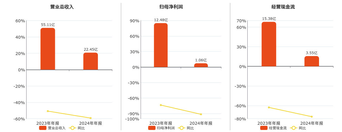 公司营业总收入为22.45亿元,较去年同报告期营业总收入减少32.65亿元,同比较去年同期下降59.25%。归母净利润为1.06亿元,较去年同报告期归母净利润减少11.41亿元,同比较去年同期下降91.49%。经营活动现金净流入为3.55亿元,较去年同报告期经营活动现金净流入减少11.83亿元,同比较去年同期下降76.91%。