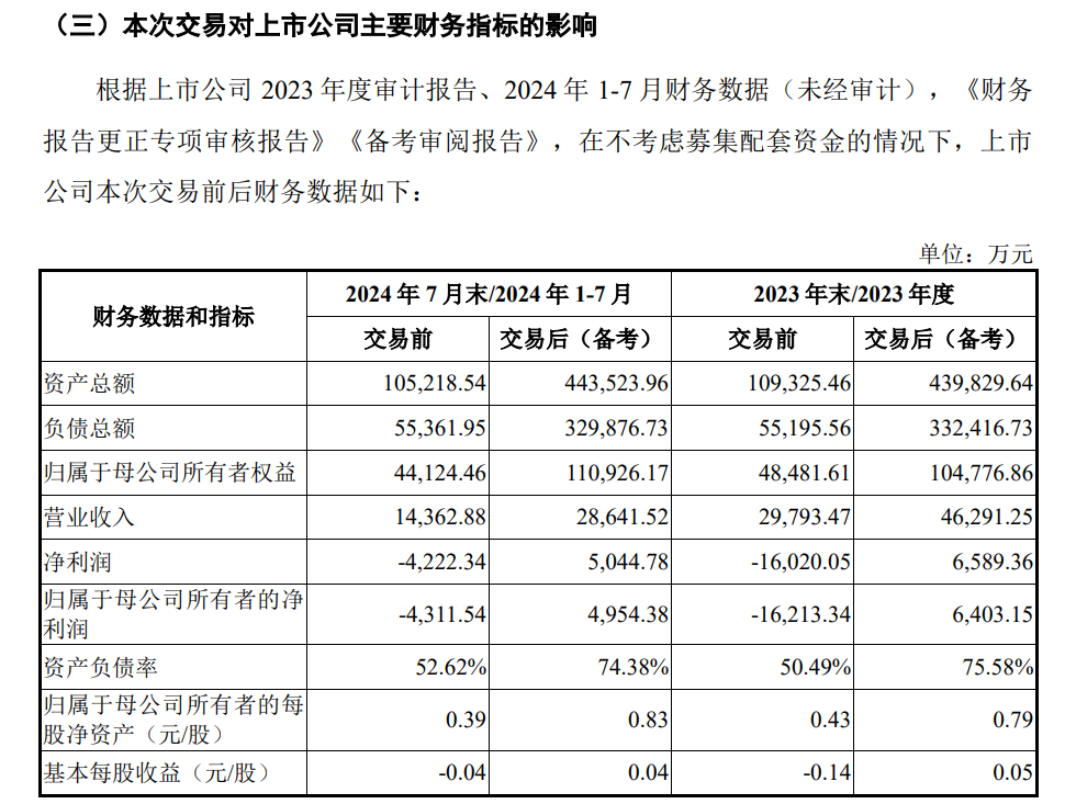 记者注意到,根据关联交易报告书(草案)披露,2023年度、2024年1月至7月,宝塔实业营业收入分别为2.98亿元、1.44亿元,归母净利润分别亏损1.62亿元、0.43亿元。而置入相关资产后,营业收入会变为4.63亿元、2.86亿元,归母净利润则“扭亏为盈”,分别盈利0.64亿元、0.50亿元。