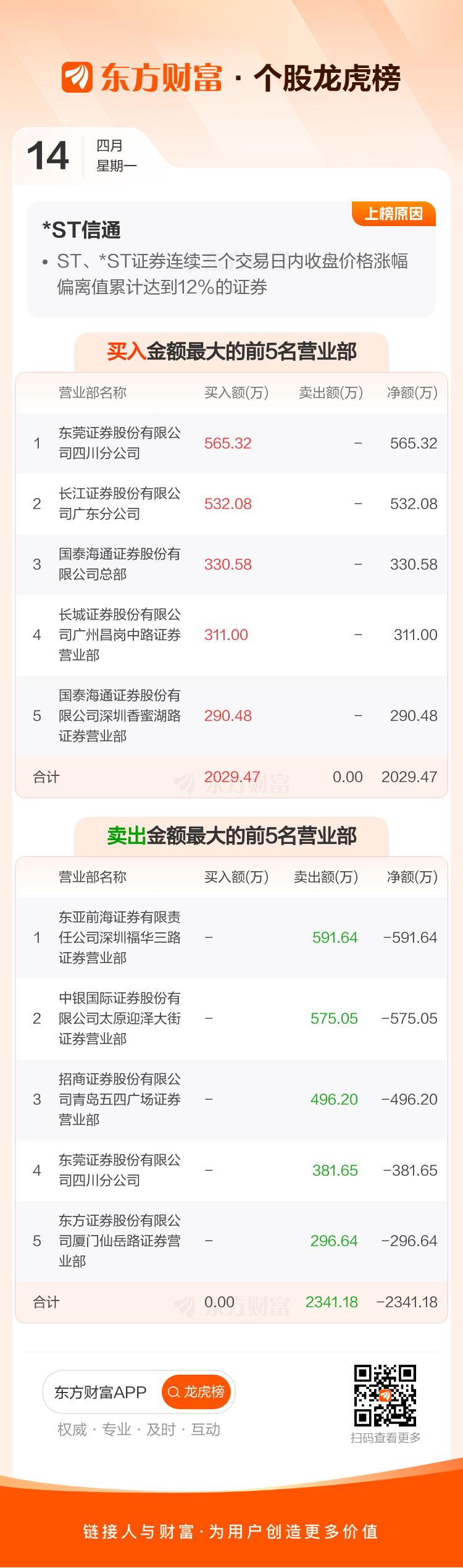 交易所2025年4月14日公布的交易公开信息显示,*ST信通因成为ST、*ST证券连续三个交易日内收盘价格涨幅偏离值累计达到12%的证券上榜。*ST信通当日收报6.53元,涨跌幅4.98%,换手率0.16%,成交额582.22万。异常期间4月10日至4月14日,期间涨幅15.78%,累计偏离值13.40%,区间成交额1.84亿。