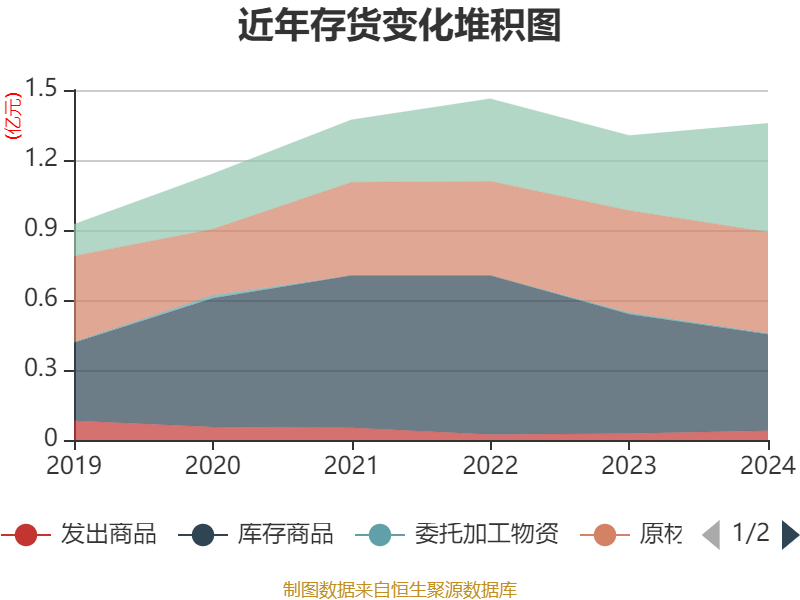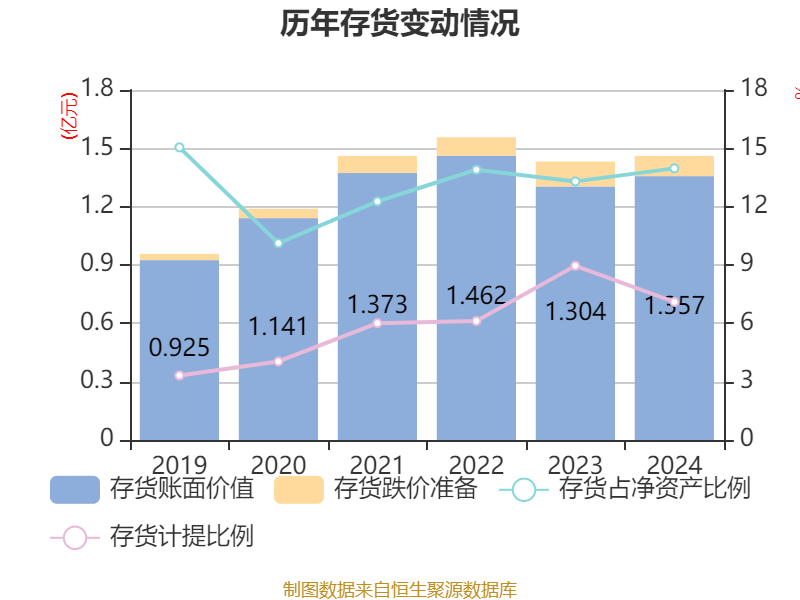 从存货变动来看,截至2024年末,公司存货账面价值为1.36亿元,占净资产的13.97%,较上年末增加525.07万元。其中,存货跌价准备为1037.16万元,计提比例为7.1%。