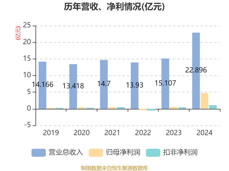 中证智能财讯双象股份(002395)4月15日披露2024年年度报告。2024年,公司实现营业总收入22.9亿元,同比增长51.55%;归母净利润4.72亿元,同比增长754.84%;扣非净利润1.08亿元,同比增长138.77%;经营活动产生的现金流量净额为1044.49万元,同比下降90.55%;报告期内,双象股份基本每股收益为1.7599元,加权平均净资产收益率为41.58%。公司2024年度分配预案为:拟向全体股东每10股派现1.5元(含税)。