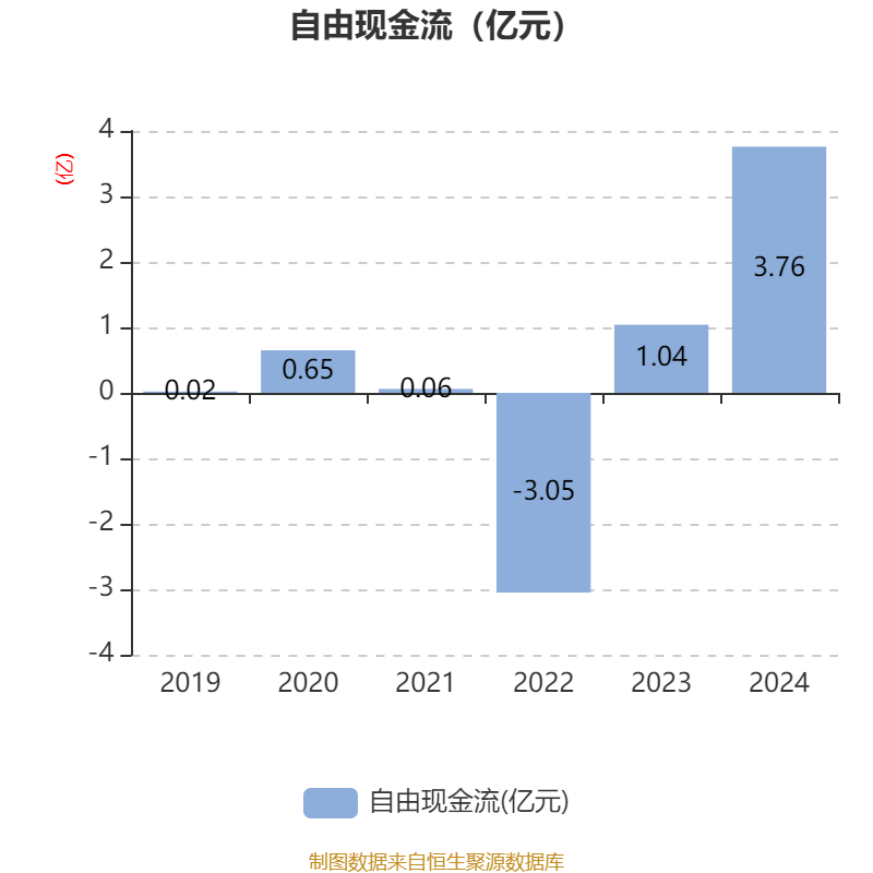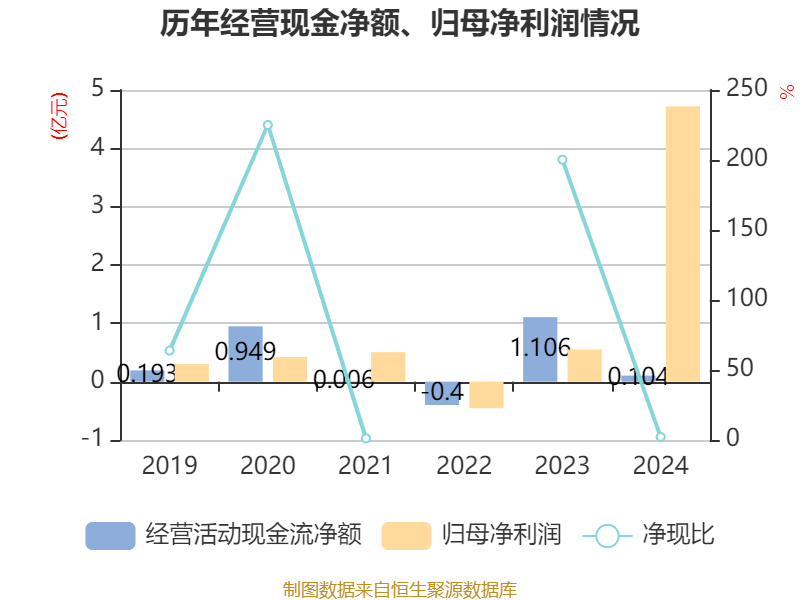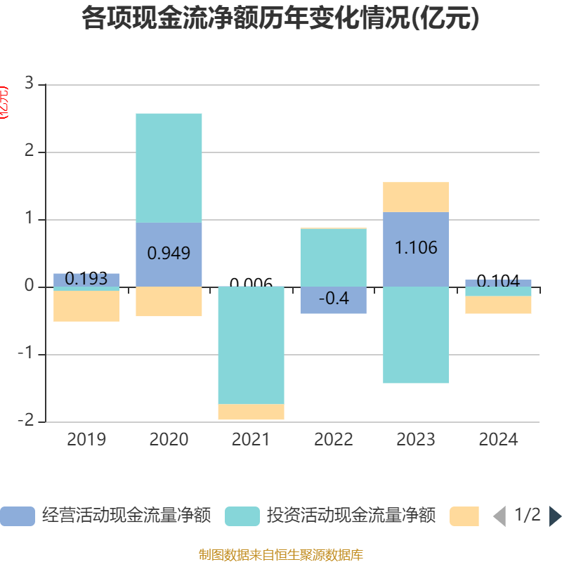 截至2024年,公司经营活动现金流净额为1044.49万元,同比下降90.55%;筹资活动现金流净额-2579.04万元,同比减少7023.76万元;投资活动现金流净额-1422.42万元,上年同期为-1.43亿元。