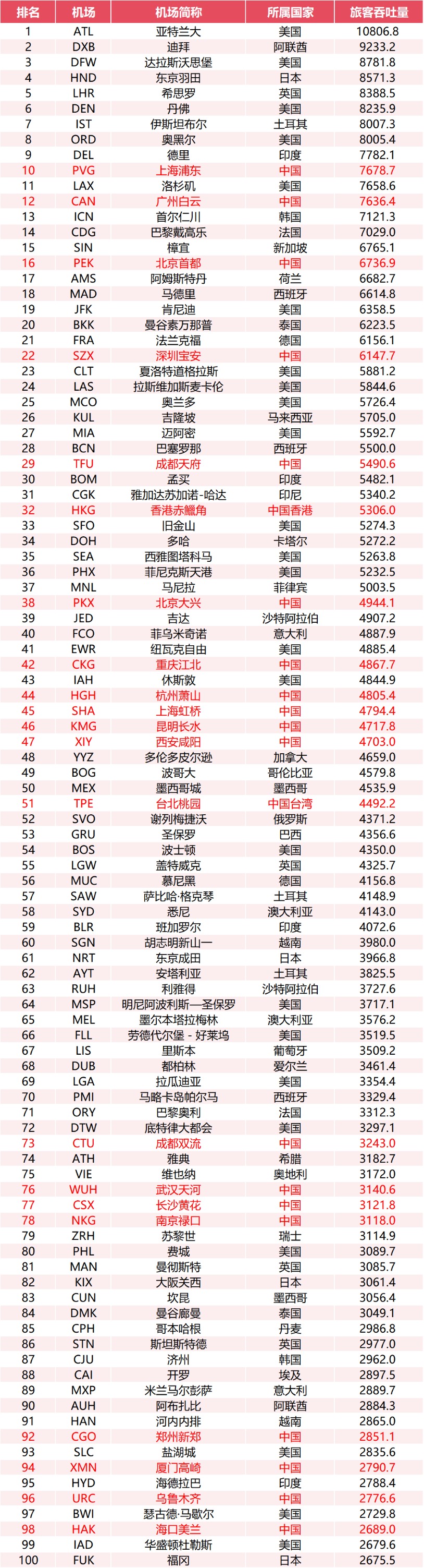 2024年全球机场旅客吞吐量排名,成都天府机场跻身全球30强